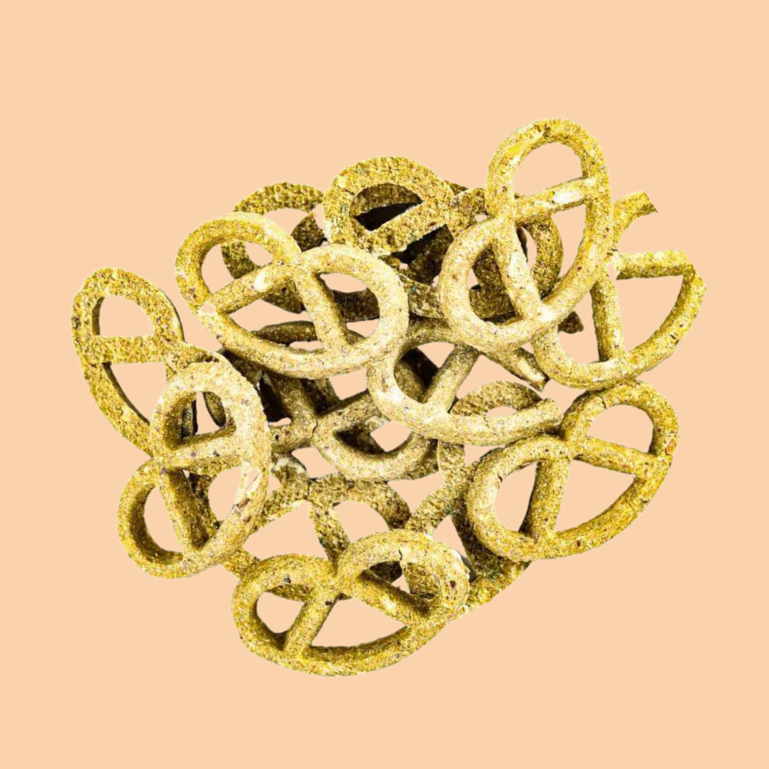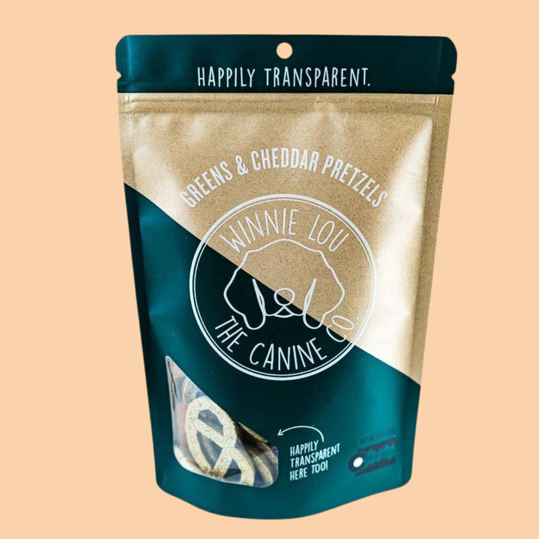 Greens & Cheddar Pretzels are the perfect treat or meal topper to give your pup a boost of Vitamins and Amino Acids with every meal! Crafted with Cheddar, Colorado Applesauce and loads of greens. Spinach & Kale for Vitamins A & K. And organic Kelp which is rich in iodine, minerals, & amino acids.Â