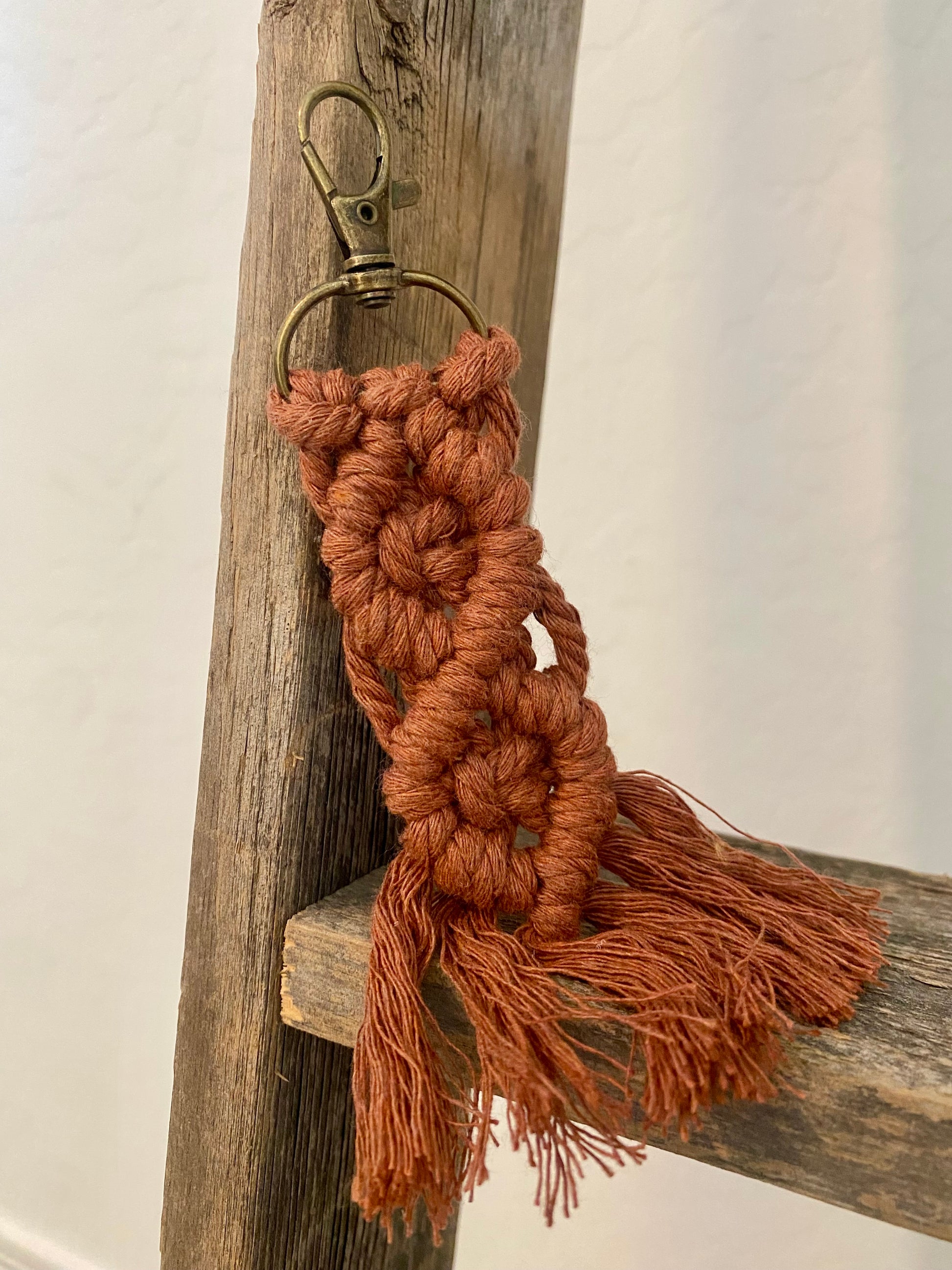 Each macrame tassel measures approximately 6 inches long, from top of keyring clasp to bottom of wristlet/fringe.