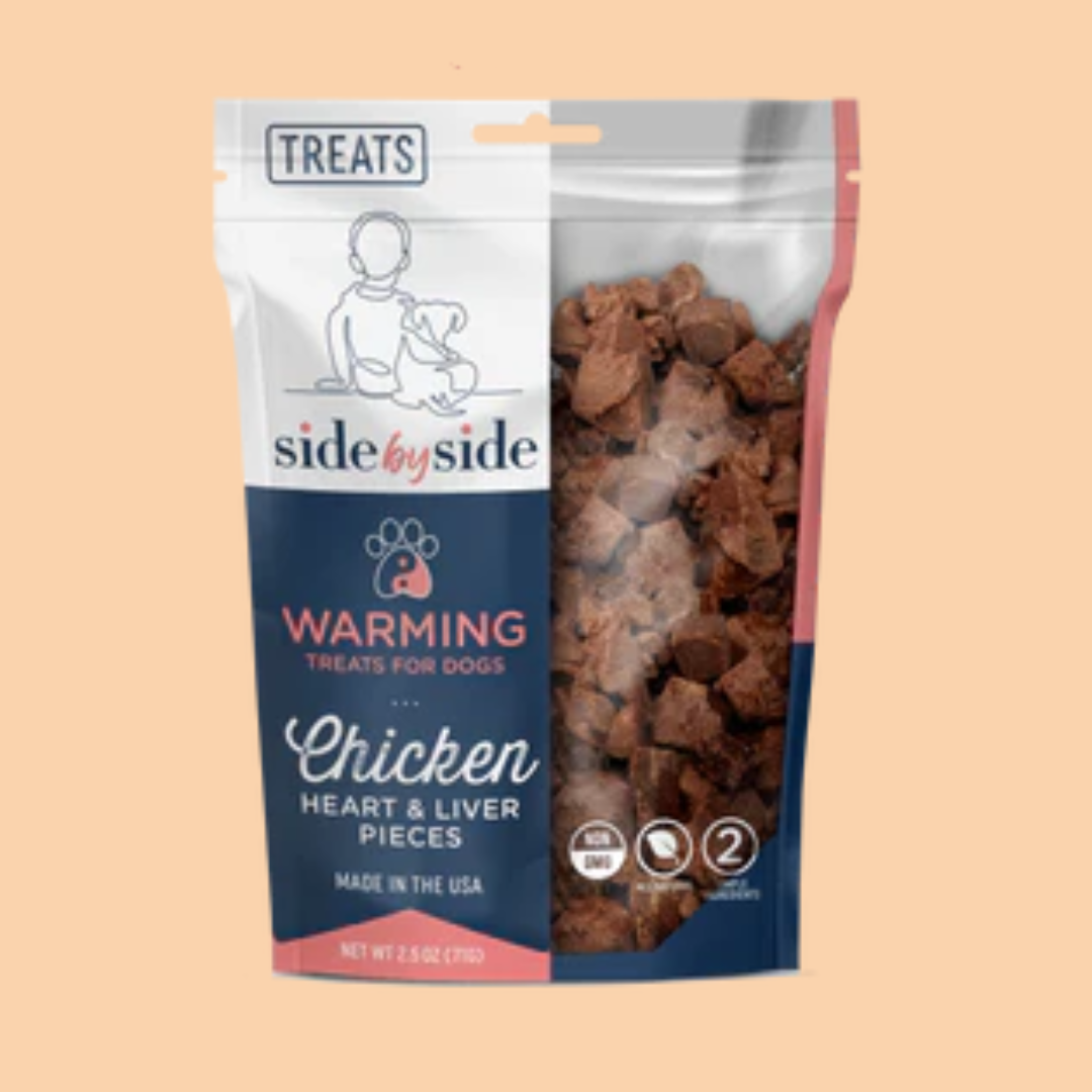 A 4oz treat bag of dried roasted chicken heart and liver pieces, with crunchy texture.