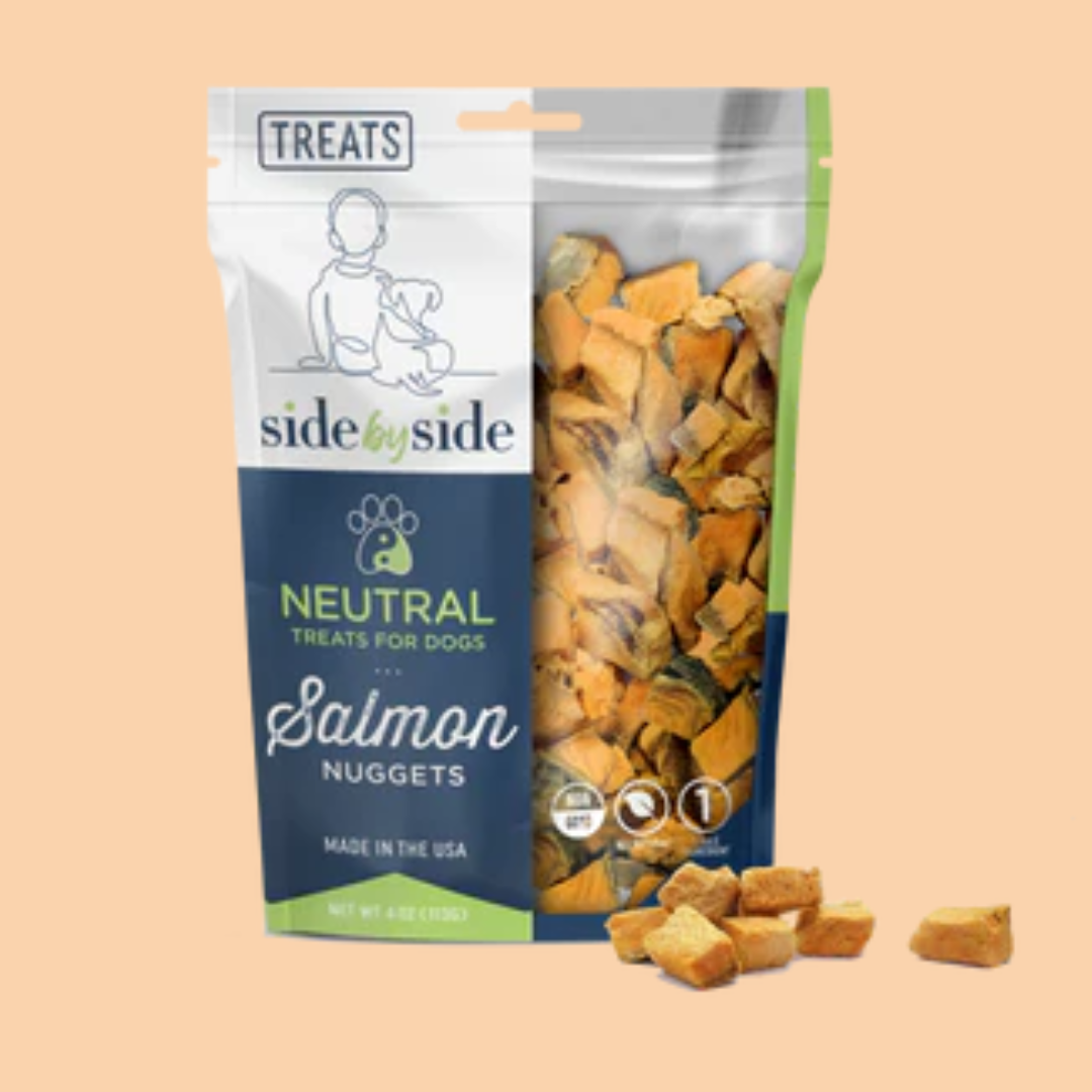 A 4oz treat bag with single ingredient, Wild Caught Salmon nuggets that have been freeze dried to lock in nutrients.